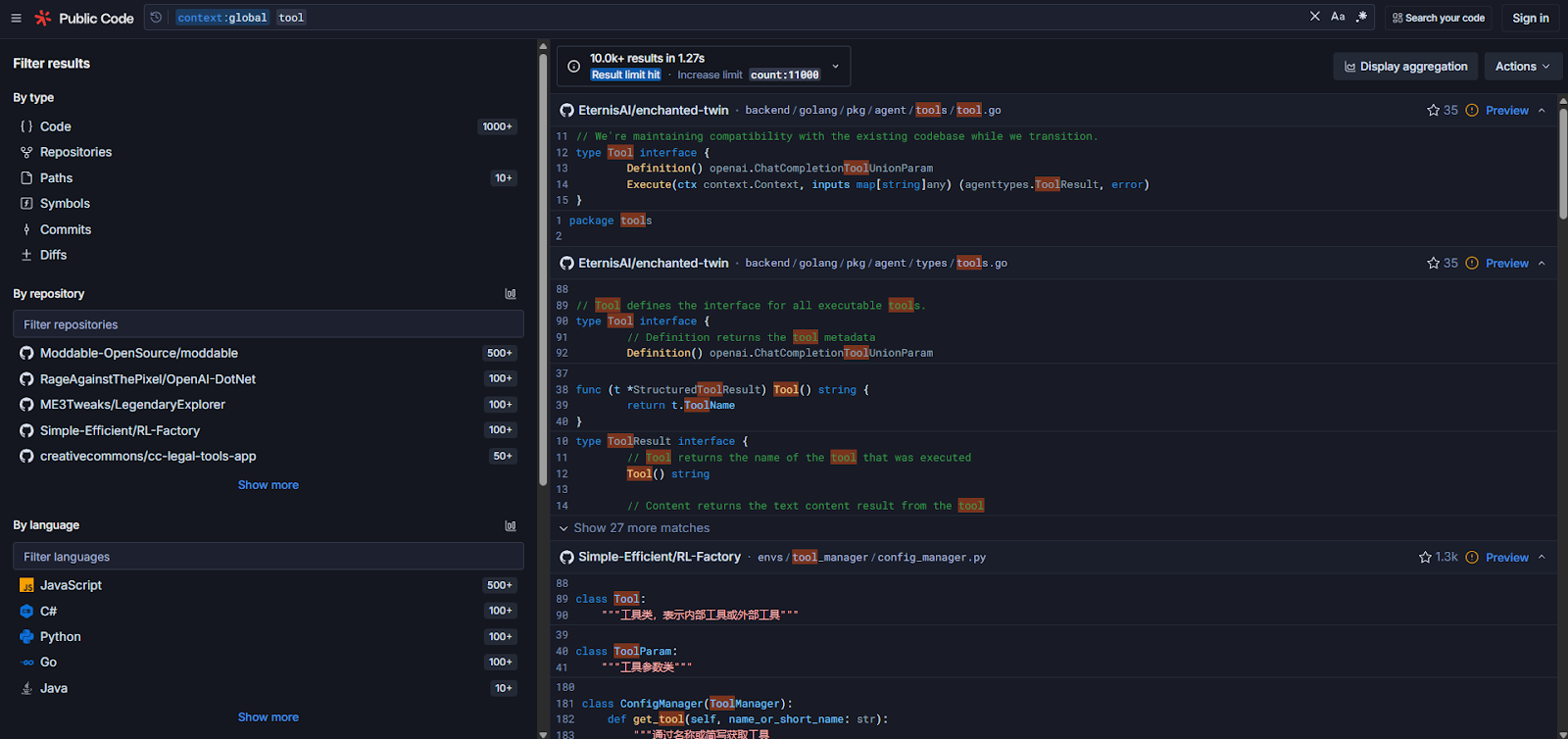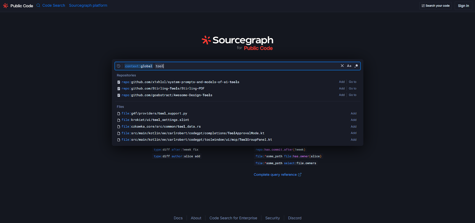 With no setup, it will return all mentions of “tool” in every public repository and all mentions of it in code.