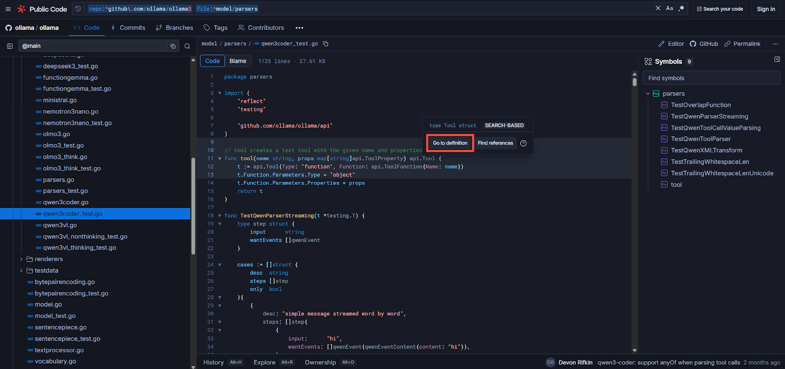 Cross-repository navigation works by following symbols from one repository to their definitions in another. Diving deeper into our previous code example for finding the “tool” keyword, you can navigate through repositories more easily and, with just a click, find the actual definition of that library or function.